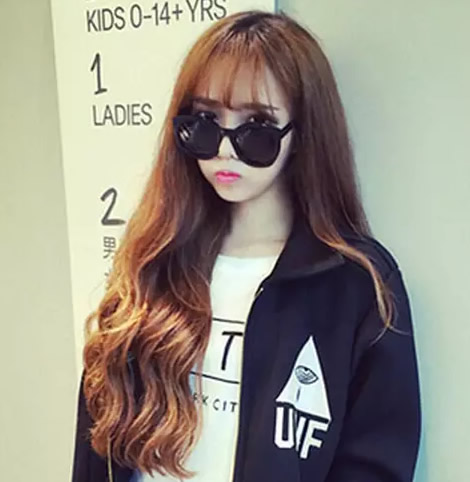 1、时尚甜美的水波纹烫发,空气刘海迷人清新,长发水波纹清纯甜美,黄棕色染发搭配上墨镜,时尚又有气质,美美的。